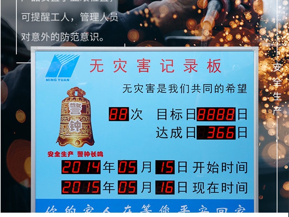 贛鑫災害天數看板采用鋁合金外框,壁掛式安裝,可自主定制功能顯示。咨詢電話18069884716